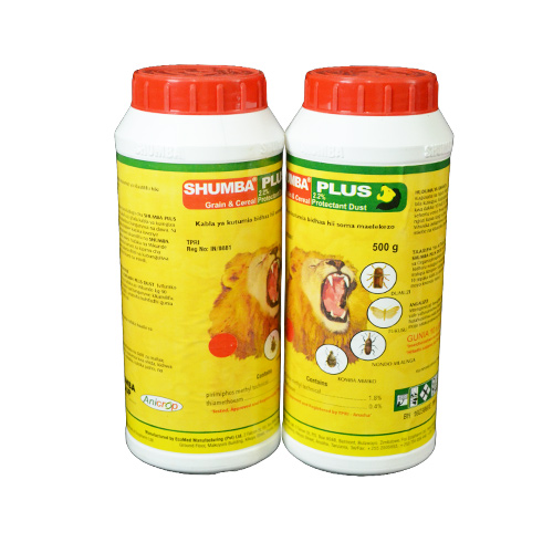 It is advised to sprinkle a small amount of SHUMBA PLUS DUST on the walls and floors of the warehouse before entering the corn or pulses that have been mixed with Shumba. It is important that the corn is removed from the cobs and then thoroughly mixed with SHUMBA PLUS DUST using a shovel.Cereals and Legumes stored using the rules of the mixing method will be safe from contamination for a period of up to twelve months.