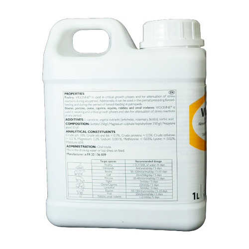 Poultry; Vigosine is used in critical growth phases and for attenuation of stress reactions during any period. Additionally, it can be used in the period preceding forced feeding and during the period of forced feeding in palmipeds. Bovine, porcine, ovine, caprine, equine, rabbits and small rodents, Vigosine is used in weaning and critical growth phases and also for attenuation of stress
